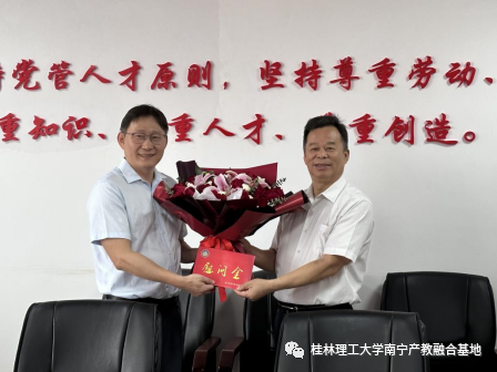 2023年5月24日,南宁市科技协会副主席潘宏球率队到南宁产教融合基地进行慰问调研。5月30日为第7个全国科技工作者日,潘宏球副主席代表南宁市科协到基地慰问科技工作者,并向第二届“广西杰出工程师奖”获得者、南宁市产教融合基地主任胡振光教授颁发慰问金及鲜花。